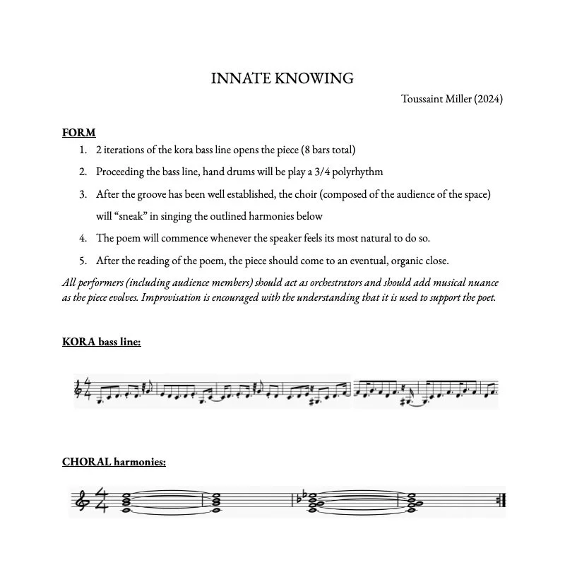 INNATE KNOWING was written as a coping mechanism for ethnic ambiguity and uncertainty. Being generational African-American, my ancestry is muddied; there is no singular branch on my genetic tree that points to a particular place in Africa. Unlike many of my Black peers who are Nigerian or Haitian or Ghanaian, I do not have direct ties to my motherland. I want to be clear that my intention for this piece is not to be despondent or pessimistic. My aim, in fact, is the opposite. I wrote this work to celebrate all the places my ancestors could have come from; the languages they could have spoken; the music they could have made. I wanted it to show how I, with no first-hand experience of the historical implication of African musical tradition, still deeply empathize and am moved by the cultural practice of the continent. The point of this work is to express that I am indeed the sum of my parts. I am the product of centuries of fine tuning and part of a rich tradition of Black artistry, even if I am not conscious of such vestiges.